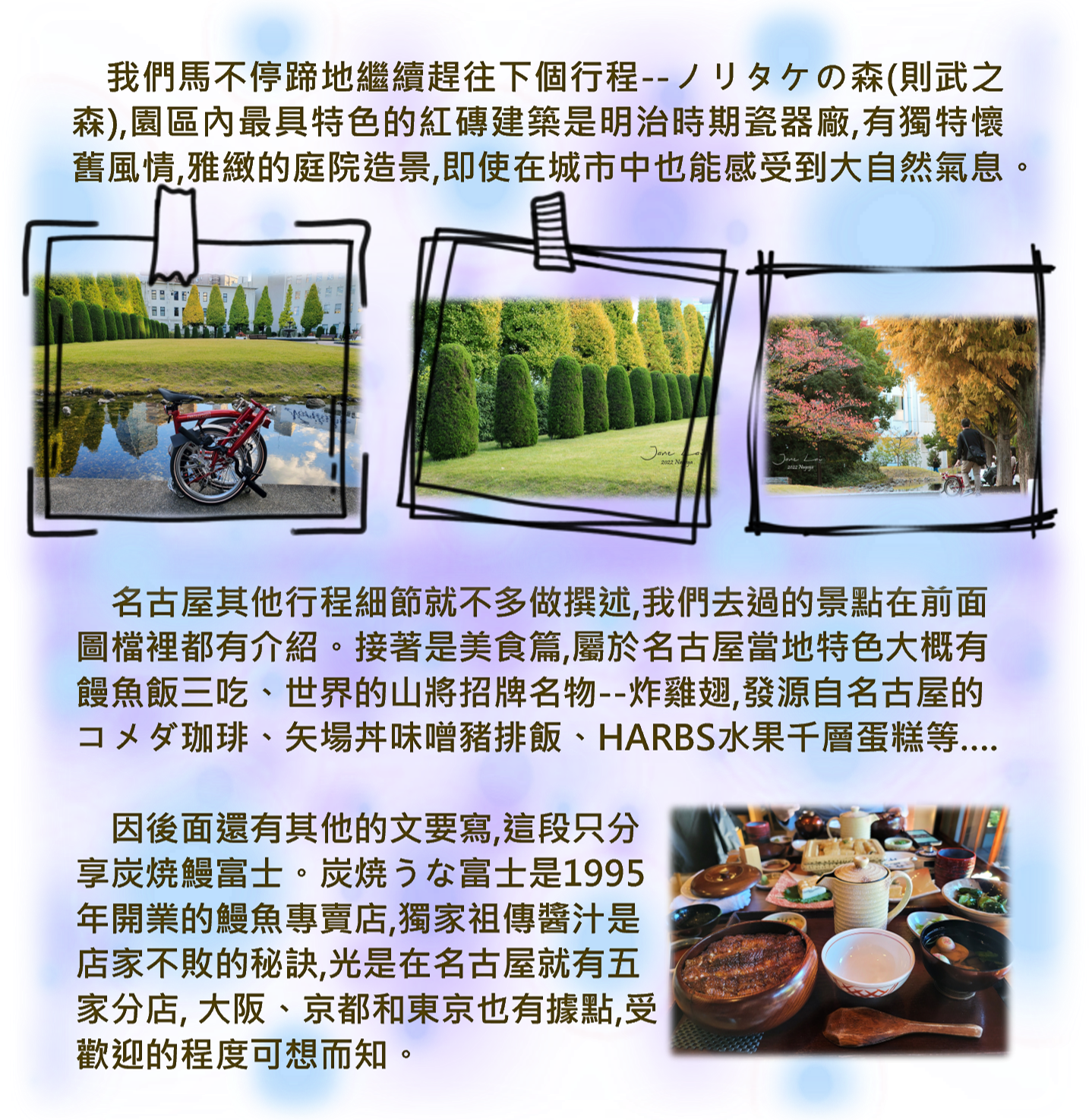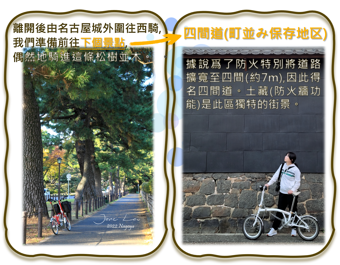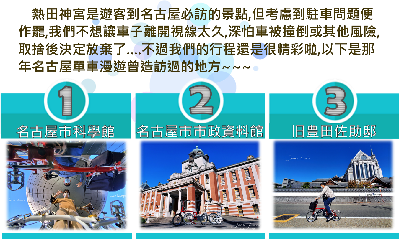 2.若以騎乘效率而言,當然是這台Brompton勝出,它的輪徑更大,同樣的距離我們可以更輕鬆到達,騎乘體感更優,我們在名古屋市區幾乎沒搭過地鐵,整天騎著它跑行程,愜意地穿梭在大街小巷裡探險.....